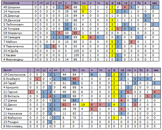 Из линии обороны у питерцев необходимо отметить Ломбертса. Николас практически не ошибался в передачах, из его 58 пасов только 3 оказались неточными. Также на счету бельгийца 1 перехват, 1 заблокированный удар, 3 отбора и 3 выноса. По объему проделанной оборонительной работы он стал лучшим в составе гостей. Естественно, не будем забывать, что именно Ломбертс скинул игровой снаряд Гарсии, когда тот забивал победный гол.