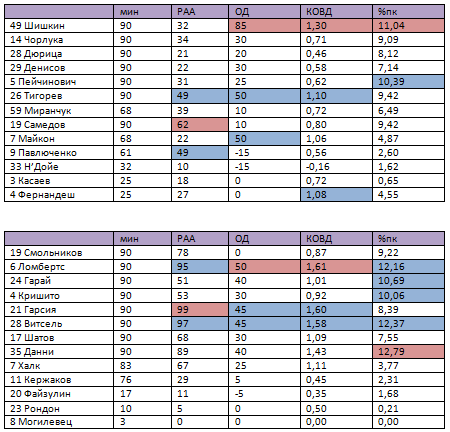Рейтинг атакующей активности (РАА): гол – 50, голевая передача (заработанный пенальти, забитый пенальти) – 25, точная передача– 1, удар в створ – 10, удар мимо– 5, обостряющая передача – 5, удачный дриблинг– 5, заработанный штрафной – 5, навесы: точные – 3, неточный – 1. Рейтинг оборонительных действий (ОД): перехват - 10, отбор – 10 и блокированный удар – 10, выносы мяча из своей штрафной - 5, фолы – (-5). Коэффициент объема выполненных действий (КОВД) определяется по формуле (РАА+ОД)/мин, то есть он равен сумме выполненных действий футболиста деленной на проведенные минуты. %пк – процент передач игрока.