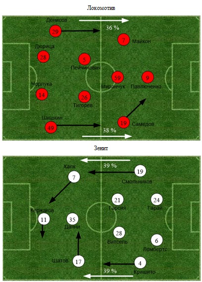 У «Локомотива» наблюдались серьезные проблемы с выходом из обороны в атаку, поэтому игроки созидания часто оказывались отрезанными от мяча, а все основными моменты москвичи создавали после стандартов. Наибольшую угрозу воротам Лодыгина представляли Павлюченко и Самедов. Роман нанес целых 5 выстрелов (1 в створ), а Александр выполнил 8 навесов, заработал на себе 3 фола, один раз приложился к мячу (неточно) и создал 1 момент. Что же касается их партнеров, то Майкон впереди заметен практически не был, зато в обороне очень активно помогал Денисову справляться с Халком. 7й номер «Локомотива» с 6 отборами стал лучшим игроком матча по данному показателю, что весьма неожиданно для футболиста его амплуа. До Миранчука хотя игровой снаряд доходил редко, но Алексей мало того, что ничего не портил (95% точность пасов), он еще и умудрился вырваться в лидеры среди «железнодорожников» по количеству созданных моментов, он трижды выводил партнеров на ударные позиции.