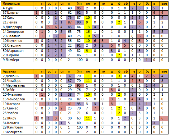 г- гол; гп –голевая передача; ус-удары в створ; у -удары всего; оп – обостряющая передача (передача, после которой партнер по команде наносит удар), п – передачи всего; %п - точность передач; пн – количество неточных передач, н –навесы, тн – точные навесы; д - удачный дриблинг (обыгрыш один в один); ф - фолы; зф –сфолили на нем; пе – перехваты; о – отборы; бу – блокированные удары; в - выносы мяча из своей штрафной площади; вве – выигранные воздушные единоборства.