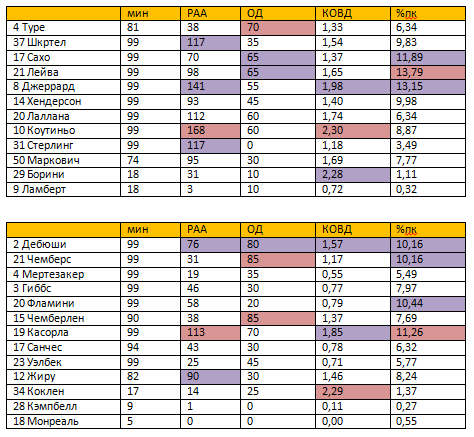 Рейтинг атакующей активности (РАА): гол – 50, голевая передача (заработанный пенальти, забитый пенальти) – 25, точная передача– 1, удар в створ – 10, удар мимо– 5, обостряющая передача – 5, удачный дриблинг– 5, заработанный штрафной – 5, навесы: точные – 3, неточный – 1. Рейтинг оборонительных действий (ОД): перехват - 10, отбор – 10 и блокированный удар – 10, выносы мяча из своей штрафной - 5, фолы – (-5). Коэффициент объема выполненных действий (КОВД) определяется по формуле (РАА+ОД)/мин, то есть он равен сумме выполненных действий футболиста деленной на проведенные минуты. %пк – процент передач игрока.