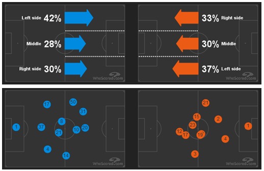 «Ливерпуль» применил схему с 3 центральными защитниками и большой группой легких техничных футболистов во главе со Стерлингом. Рахим вместе с Марковичем создали мощнейшее давление на правый фланг обороны соперника. Особенно ярко это было выражено в первом тайме. В итоге Лазар отметился 2 ударами, 4 обостряющими передачами и 3 успешными обводками. Стерлинг в этом сезоне – это чуть ли не главная звезда команды Роджерса, вот и в этом матче он не остался в тени, собрав коллекцию из 4 ударов, 3 обостряющих передач и 5 заработанных на себе фолах . Кстати, он же стал лучшим дриблером поединка.