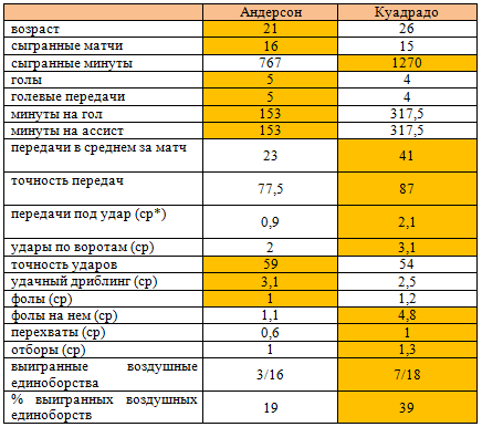 Что мы видим, бразилец превосходит колумбийца по части результативности, ему на каждое результативное действие требуется в 2 раза меньше времени (153 минуты против 317), он провел на поле всего 767 минут, но этого было достаточно, чтобы собрать статистику: 5+5. Еще Андерсон превосходит Куадрадо в точности ударов (59% против 54%) и, что особенно удивительно, в количестве успешных обводок (3,1 в среднем против 2,5). В общем, у этого футболиста с техникой полный порядок. Естественно, как и всем молодым бразильцам, Фелипе свойственна некоторая расхлябанность в обороне, если Хуан выполняет по 1,3 отбора и 1 перехвату за матч, то у Андерсона эти показатели ниже 1 и 0,6 соответственно. Еще отметим, что нашему герою нужно улучшить культуру паса. На данный момент он выполняет в среднем по 23 передачи с точностью в 77,5 % и создает всего 0,9 моментов для партнеров. Для сравнения у Куадрадо эти показатели значительно выше и соответственно равны: 41, 87% и 2,1.
