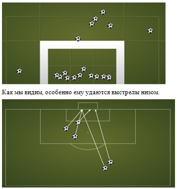Конечно, до уровня Тевеса Дибала пока еще не дорос. Он уступает Карлосу и в результативности, и в культуре паса, и в реализации моментов. Так Пауло на каждый гол требуется нанести по 6,7 выстрелов, а Тевесу всего 5,3. Понятное дело, что молодому аргентинцу предстоит выполнить еще большой объем работы над собой, но уже сейчас он выделяется своей техникой, в среднем Дибала выполняет по 3,1 успешные обводки за встречу, также он довольно трудолюбив, не боится черновой работы: 0,8 отборов и 0,6 перехватов в среднем. Что немаловажно Пауло не жадничает в ответственные моменты, неслучайно в его активе 6 голевых передач. Еще скажем, что Дибала – это ярко выраженный левша, все свои мячи он забил именно с левой. Вот так выглядит распределение его ударов и голов.