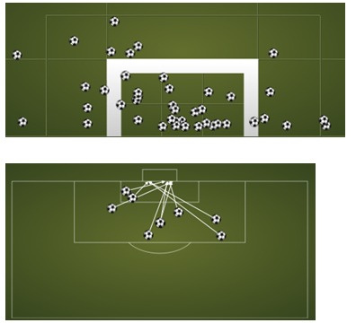 Фелипе обладает поставленным ударом, причем с обеих ног и с разных дистанций. В этом сезоне он из 5 своих мячей два забил с правой и 3 с левой, а вот так выглядит распределение его ударов по воротам соперников.