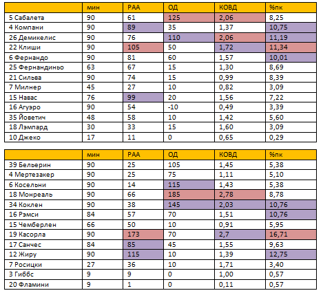 Рейтинг атакующей активности (РАА): гол – 50, голевая передача (заработанный пенальти, забитый пенальти) – 25, точная передача– 1, удар в створ – 10, удар мимо– 5, обостряющая передача – 5, удачный дриблинг– 5, заработанный штрафной – 5, навесы: точные – 3, неточный – 1. Рейтинг оборонительных действий (ОД): перехват - 10, отбор – 10 и блокированный удар – 10, выносы мяча из своей штрафной - 5, фолы – (-5). Коэффициент объема выполненных действий (КОВД) определяется по формуле (РАА+ОД)/мин, то есть он равен сумме выполненных действий футболиста деленной на проведенные минуты. %пк – процент передач игрока.