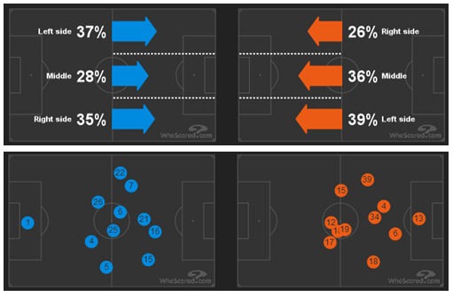 К сожалению для всех поклонников «Сити» игра их любимцев разнообразием не отличалась. Сильва все-таки не смог найти бреши в центральной зоне соперника. О резком крене в сторону правого фланга нападения говорят еще и удары. Из 12 выстрелов 9 были выпущены именно из этой зоны, из которых 3 были заблокированы и только 3 угодили в створ.