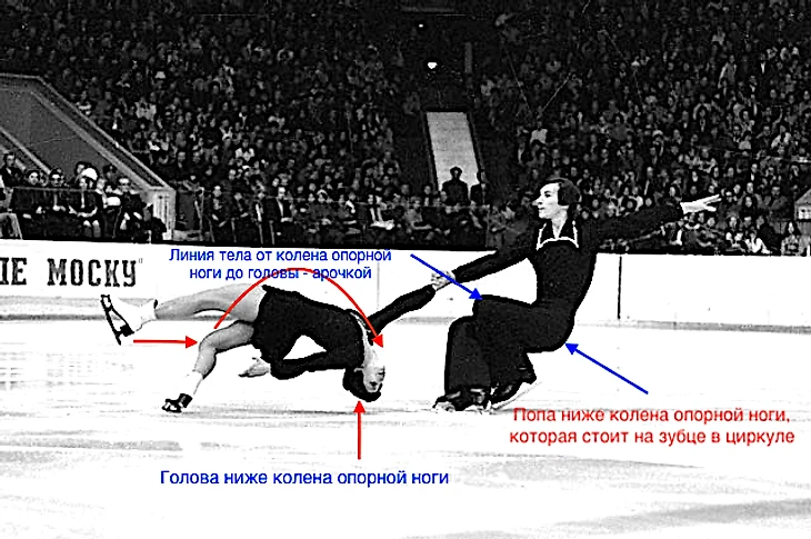 Что такое "низкая" позиция и какие требования? Для партнера: Ягодицы должны быть не выше колена опорной ноги - ноги, которая стоит в зубце (на зубце) на циркуле. Иными словами попа должна быть опущена ниже, чем колено левой ноги (рассматриваем обычное направление движения. Для партнерши: Наружние тодесы (вперед-наружу и назад-наружу) - голова должна быть на уровне или ниже колена опорной ноги, а тело от колена опорной ноги до головы (линия тела точнее) должна быть плоской или небольшой аркой. Посмотрим пример на Ирины Родниной с Александром Зайцевым - синие стрелочки про попу для партнера, красные стрелочки про голову и тело партнерши (тодес назад-наружу).