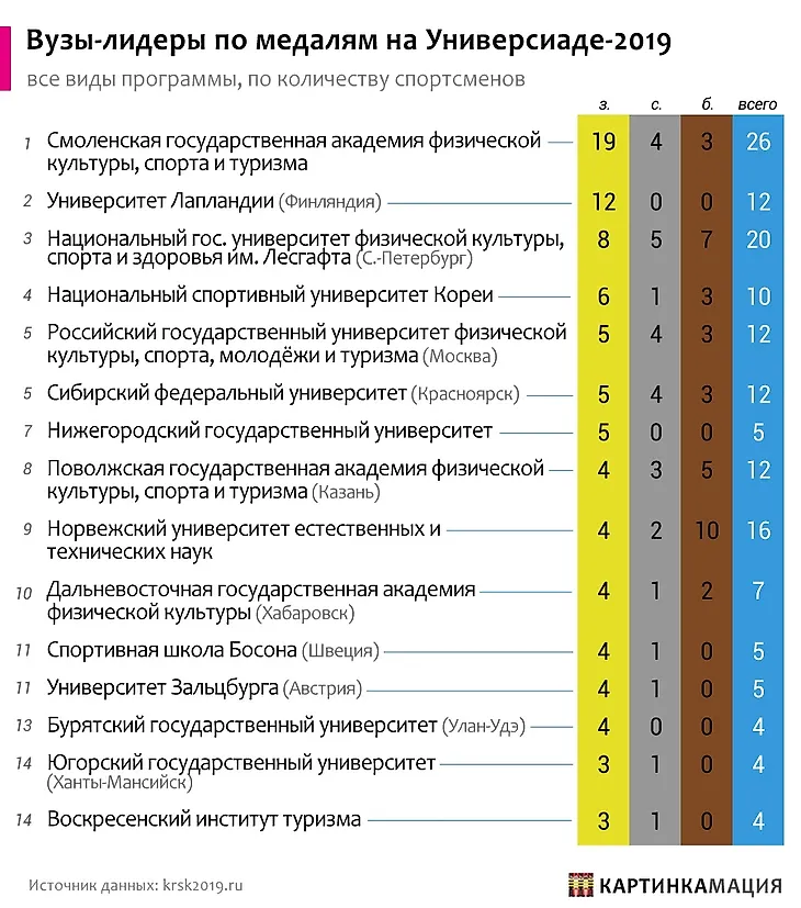 Автор Aktavian Медальный зачёт вузов на Универсиаде 2019 года: итоги