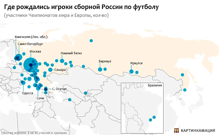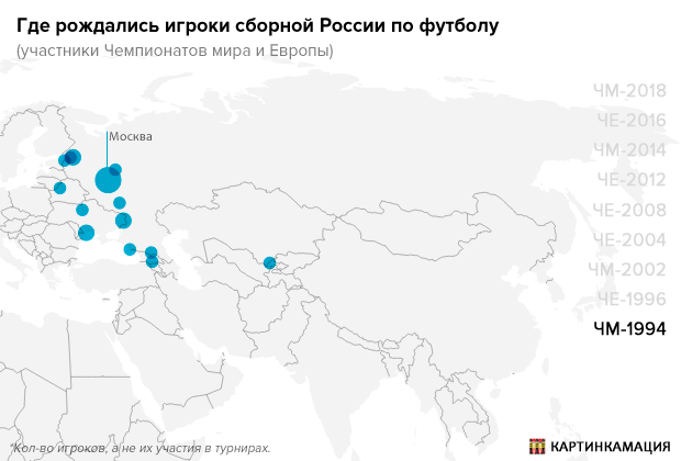 Предсказуемо центр экспорта игроков в сборную России — Москва и Подмосковье. Москвичей по рождению на ЧМ и ЧЕ ездило 33 человека. Санкт-Петербург по этому показателю занимает второе место — 6 футболистов (плюс один из Ломоносова, который формально входит в Санкт-Петербург).