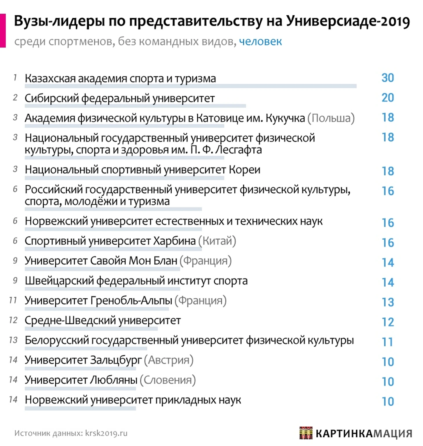 Из российских учебных заведений впереди Сибирский федеральный университет в Красноярске — столице Универсиады.Половина российских спортсменов, выступающих в личных видах, учится в физкультурных вузах. Это без учёта, например, Института физической культуры, который входит в Сибирский федеральный университет.