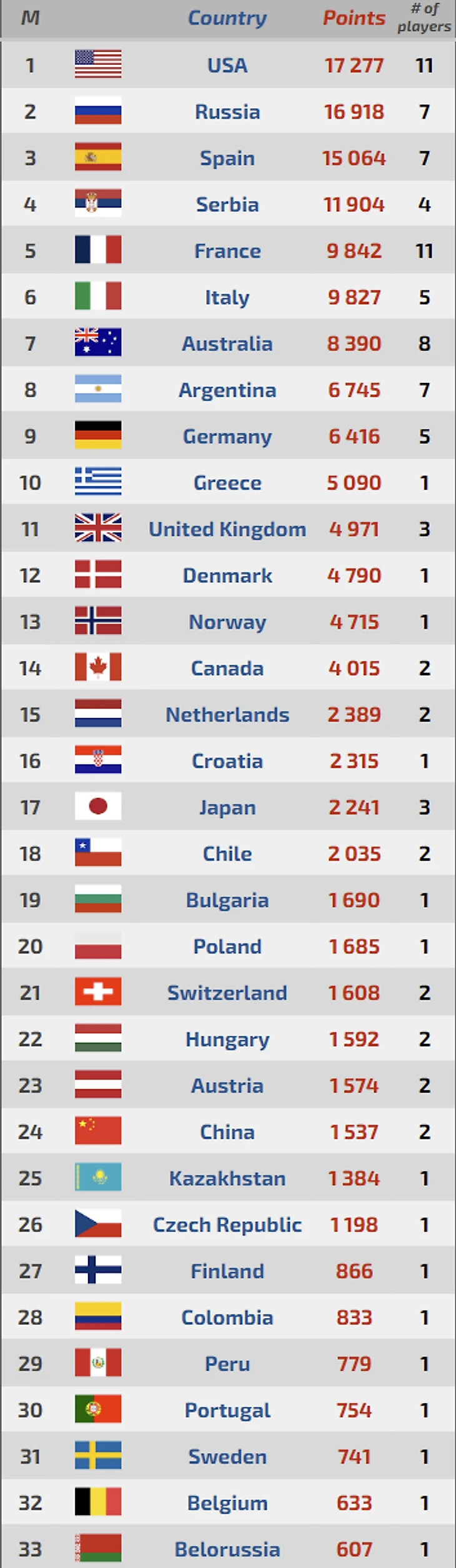 Всем привет! Очередной апдейт неофициального (пока) командного теннисного рейтинга по странам на основе сумм вышедших сегодня индивидуальных рейтингов мужской и женской первой сотни и сводный (суммарный). (Более подробно, как это всё работает - в моем выпуске на прошлой неделе: Какая страна сильнее всех в теннисе прямо сейчас? - Deuce - Блоги - Sports.ru)
