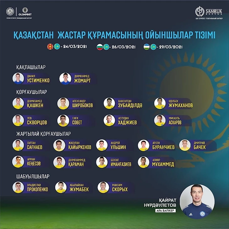 Тренерский штаб молодежной сборной Казахстана U21 объявил состав футболистов для участие на товарищеском турнире Antalya Cup-2021 в Турции. В список игроков вошли два легионера Дмитрий Бачек («Побленсе», Испания) и Микаэль Аскаров («Фенербахче», Турция)