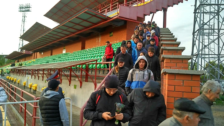 На фото вы видите, что остался узкий проход, а людям пришлось потолкаться, чтобы элементарно выйти со стадиона. Вы можете заметить, снизу есть широкая площадка, которая может позволить комфортно покинуть трибуны и выйти за пределы стадиона. По сообщению очевидца, на вопрос о том, почему же нельзя пройти снизу, люди в погонах ответили - «Оцепление же тут стоит, нельзя».