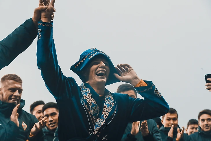 Футболисты традиционно начали подкидывать счастливого Шаву, а после этого он получил специально-подготовленный «Чапан» (традиционное казахское одеяние), с фамилией и номером на спине.