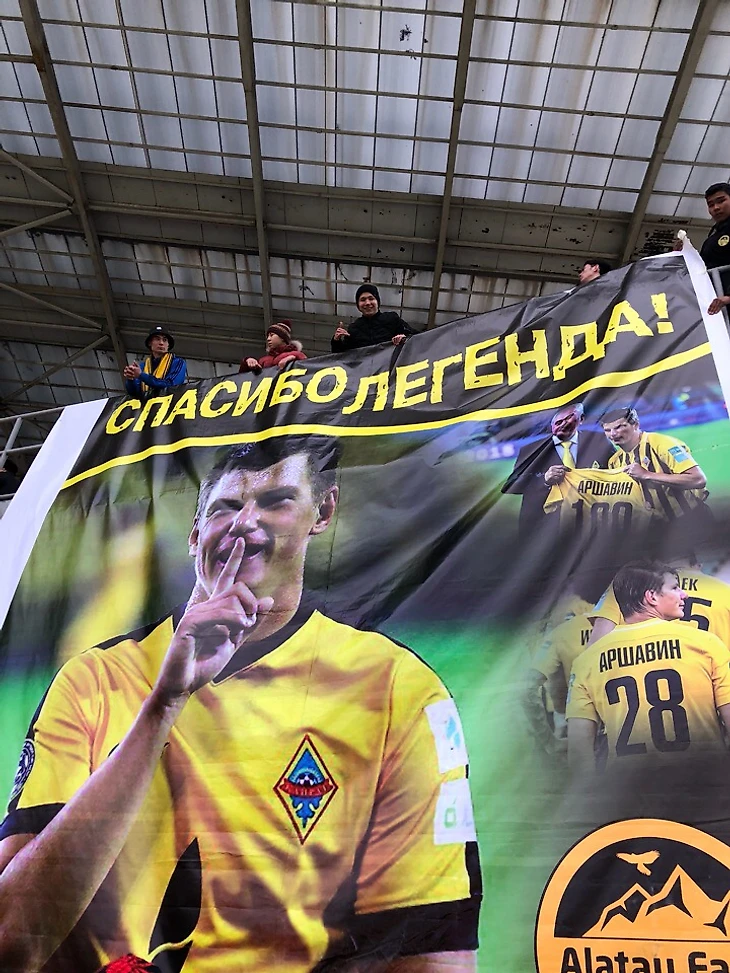 Зазвучала песня «Привет, Андрей» в исполнении красивых болельщиц на трибунах, а на поле объятья и рукопожатия с коллегами и аплодисменты болельщикам на фанатском секторе. Но дальше началась главная часть мероприятия. Аршавин прошелся по коридору из воспитанников академии клуба, послушал речь от легендарного местного голкипера Ордабаева.