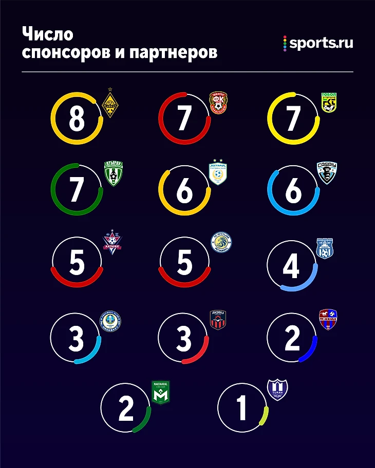 Клубы активно сотрудничают с компаниями из совершенно разных сфер. Лидеры – это поставщики воды, букмекеры и общепит (у «Кызыл-Жара» и «Шахтера» сразу по два партнера из этого сегмента).