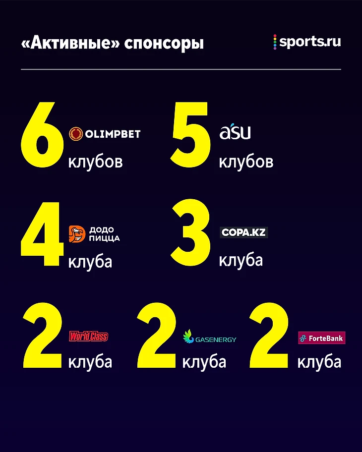 Интересно, что некоторые компании входят в казахстанский футбол гораздо активнее конкурентов. К примеру, торговая марка ASU значится в списке партнеров сразу у пяти клубов. Очень активны Dodo-пицца и Copa.kz.
