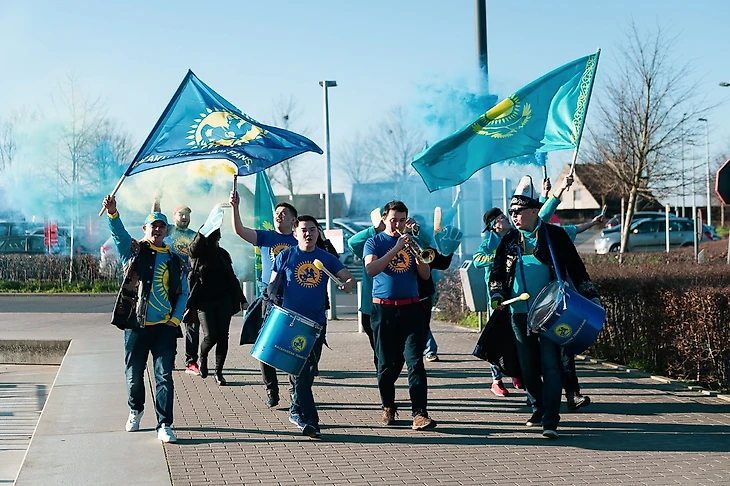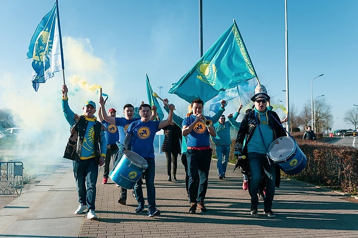 Болельщики сборной Казахстана в Кортрейке поддерживают свою сборную на Кубке Федерации.