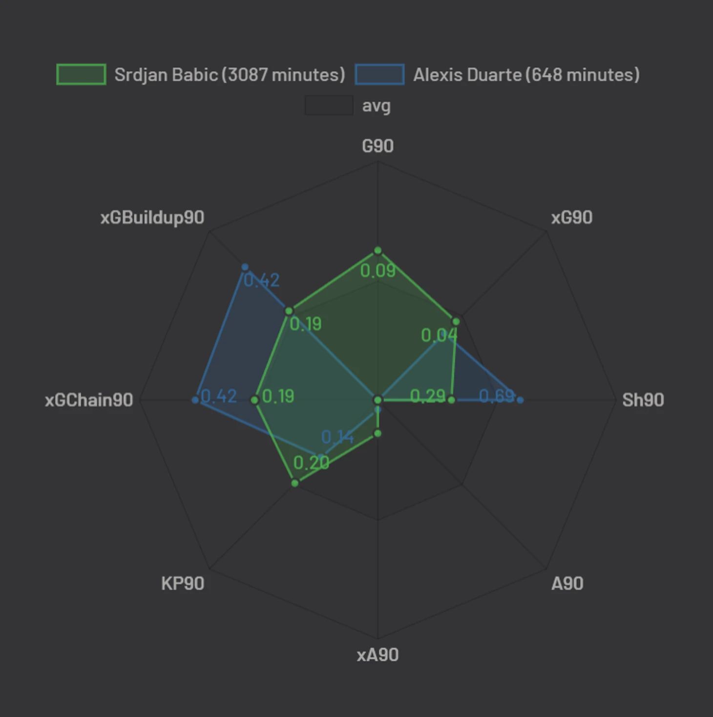 Собственно чтобы понять насколько он превосходит или уступает спартаковцам.Взглянем на сравнительную метрику между сербом и Дуарте, к примеру.