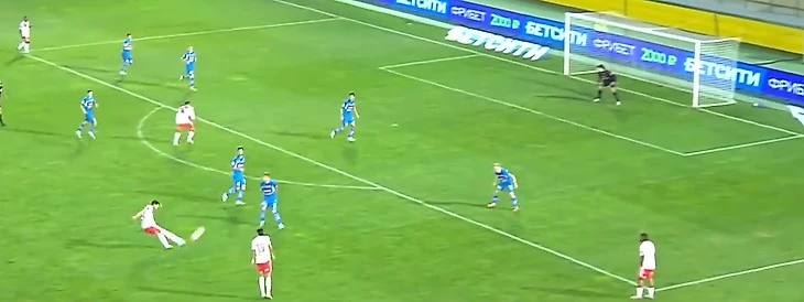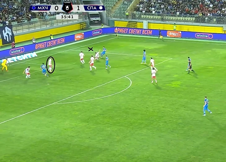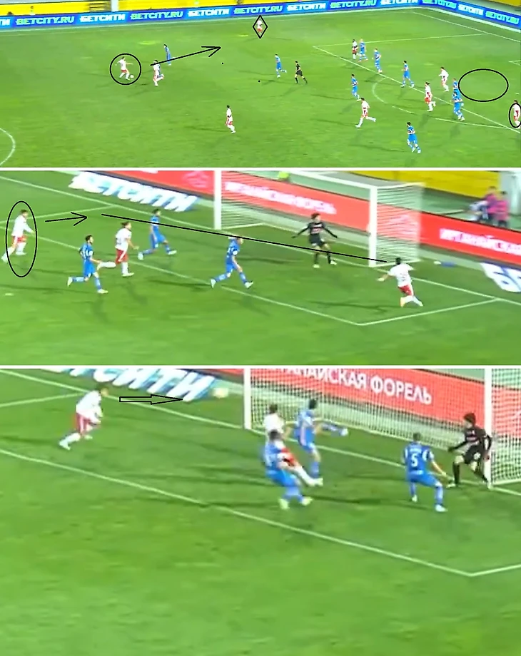 Умяров не успевает накрыть прострел( при этом Литвинов находится спиной к воротам.Казалось бы ничего опасного не предвещает эта атака.Но мгновение и счет равный.Опорная зона не накрывает и мяч на фланге, после прострела случается гол...