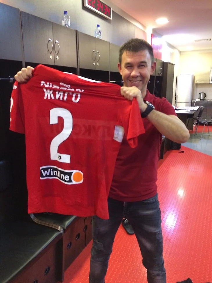 В победной раздевалке герой матча Самюэль Жиго подарил свою майку Рамилю Шарипову - тренеру по физической подготовке, который сыграл важную роль в восстановлении защитника после разрыва "крестов".
