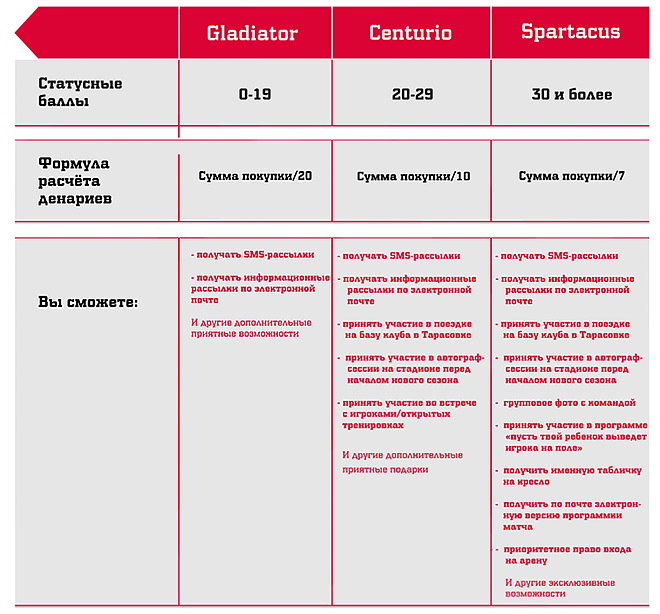 Первый из них (Gladiator) присваивается с самого начала, а перейти на следующие уровни можно с помощью статусных баллов, которые автоматически начисляются на карту, например, за посещение домашних матчей (если вы просто посмотрели любую игру «Спартака» в Тушино, на ваш счёт будут зачислено два балла, а если приехали на стадион за 60 минут до начала встречи – три). Статус Centurio (с помощью него вы сможете, например, принять участие в поездке на базу в Тарасовку или во встрече с футболистами) появится сразу после того, как на счету будет 20 баллов, Spartacus же предполагает самый расширенный пакет бонусов, в число которых входит прикрепление именной таблички на ваше кресло на «Открытие-Арене» (когда их число достигнет 30).