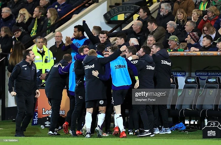 Фото: тренерский штаб "Дерби" празднует победу над "Норвич Сити" (4:3).