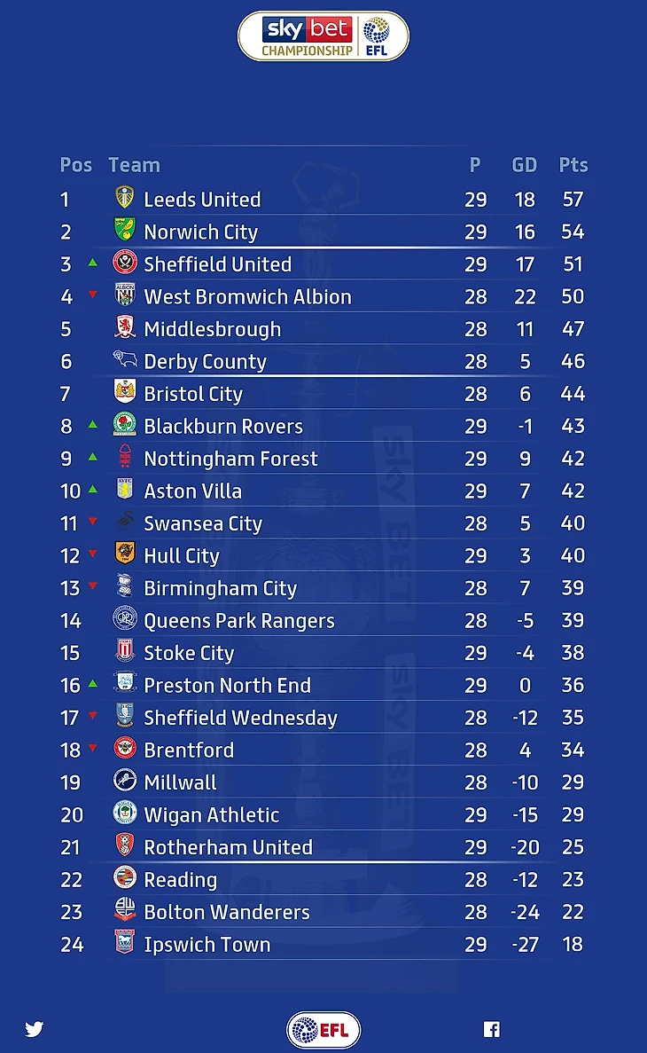 «Астон Вилла» «Бирмингем» «Болтон» «Вест Бромвич Альбион» «Ипсвич Таун» «Куинз Парк Рейнджерс» «Рединг» «Ротерхэм» «Сток Сити» «Уиган» «Шеффилд Уэнсдей» «Шеффилд Юнайтед»