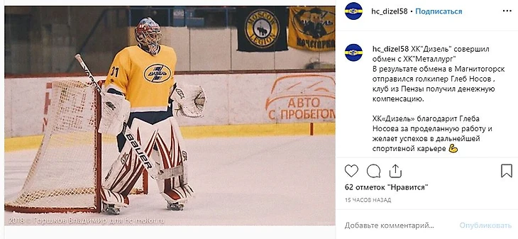 Как сообщает инстаграм-аккаунт «Дизеля» из Высшей хоккейной лиги, пензенский клуб совершил обмен с магнитогорским «Металлургом». В наш город отправляется вратарь Глеб Носов, а «Дизель» получит денежную компенсацию.