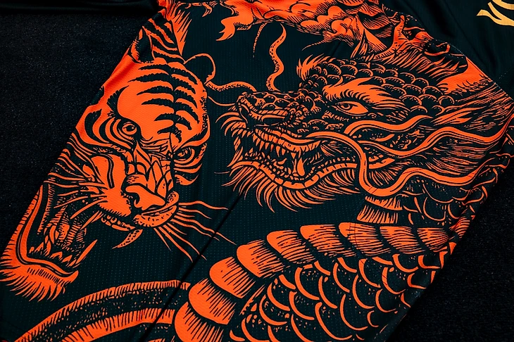 Основная идея комплекта – противостояние тигра и дракона. На рукавах чёрного свитера изображены ярко-оранжевые существа, выполненные в стиле китайской татуировки. Такой стиль часто встречается в уличном арте и современном графическом дизайне с отсылкой к восточным традициям.