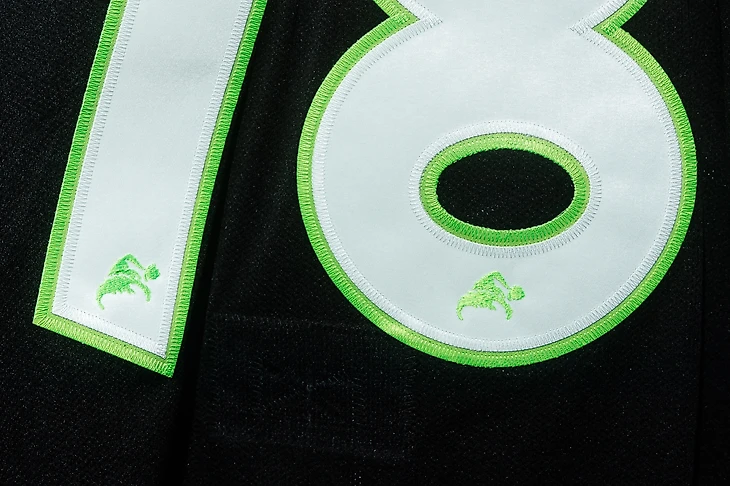 Для оформления номеров и фамилий использовался кастомный шрифт. Буквы и цифры выполнены с неровными пропорциями и мультяшным характером, что дополняет концепцию формы, посвящённой персонажу. Ярко-зелёная обводка перекликается с цветом зелёного Гринча.