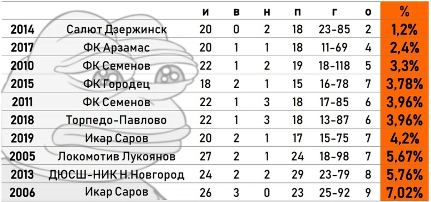 PS. Интересно будет узнать, а было ли выступление «Семенова» в 2010 году худшим в истории чемпионата высшей лиги? Отнюдь нет! В своеобразном рейтинге худших сезонов это будет третий результат за 20 лет. Самое худшее выступление принадлежит дзержинской команде «Салют» в 2014 году. Всего 2 набранных очка за две ничьи в сезоне. И это всего чуть больше одного процента от максимально возможных очков. Второе место у ФК «Арзамас» в недалеком 2017 году с результатом 2,4% очков. Всего в таблице приведены 10 сезонов, когда команды набирали минимальный процент очков. Что примечательно, в нулевые годы не было такого явления как ярко выраженный аутсайдер, который выступает из рук вон плохо. Зато за последние 10 лет такая команда обязательно имеет место быть. Что бы это значило?