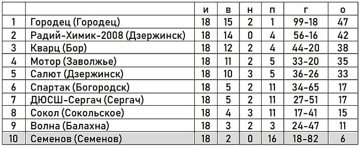 Таков был один из самых неудачных сезонов для семеновской команды, растерявшей в межсезонье полкоманды и решившей сыграть в высшей лиге своими силами с небольшим подкреплением. Неудачно начав, команда на фоне непонятных перспектив и задач, да еще и оставшись без тренера, окончательно развалилась к середине сезона. Дальше, можно уже сказать, просто доигрывала чемпионат. Не сбылись и надежды на укрепление состава после первого круга, о которых сообщал директор клуба Владимир Ширкунов и не удалось договориться с новым тренером. Переговоры велись с Виктором Тихоновым, который все-таки возглавит «Семенов» в следующем 2011 году. Да, мы выступили неудачно, но при всех наших тогда обстоятельствах приняли вызов продолжать играть с лучшими командами области, набираться опыта, и, несмотря ни на что, клуб не бросили, доиграли сезон и не сдались из-за плохих результатов.