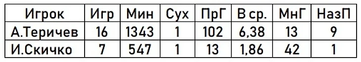 На вратаря Артема Теричева обрушилась вся мощь команд соперников. Ему пришлось принимать на себя удар этого сезона по пропущенным мячам. Статистически, показатели, конечно такие, что остается только посочувствовать. Можете себе представить, что такое пропускать голы в свои ворота в среднем через каждые 13 минут в общем количестве 102 за 16 проведенных игр…