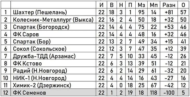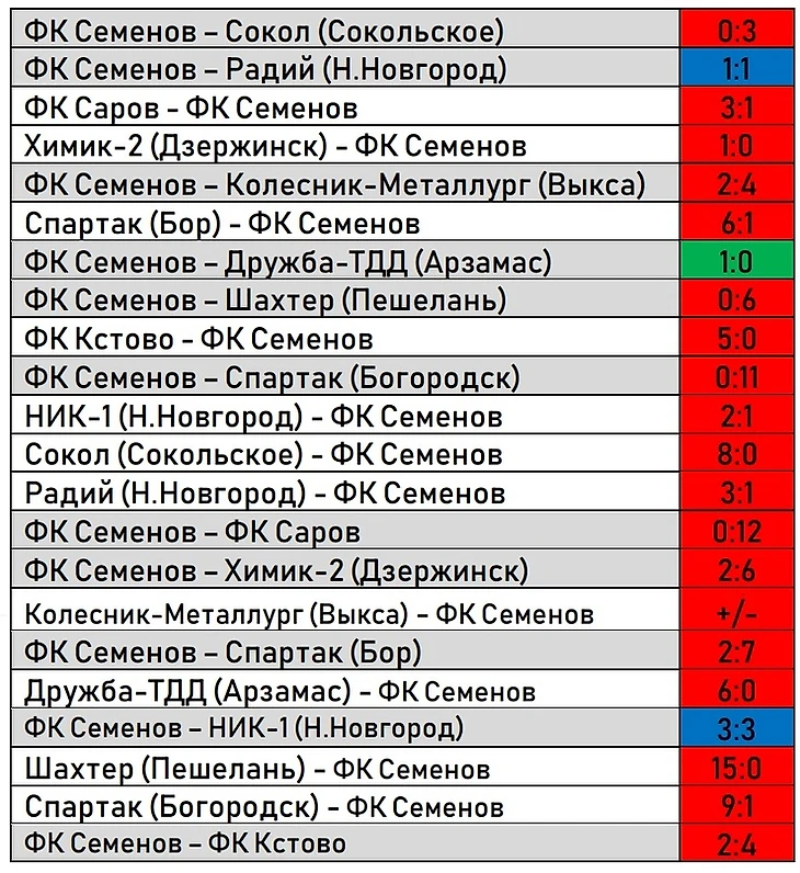 Все 5 очков были набраны дома, на выезде «Семенов» терпел только поражения. За сезон случилась только одна игра без пропущенных голов, та самая победная и 9 матчей, где не смогли забить. 12 игр, а это половина от всех, закончились крупными поражениями.