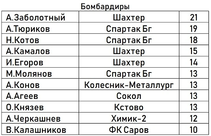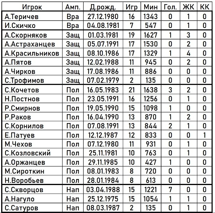 Как видим из приведенной таблицы после победы над арзамасской «Дружбой» семеновцы не смогли выиграть ни в одной игре, проведя самую длительную серию игр без побед – 15 матчей, включая игру с «Колесником», на которую «Семенов» вовсе не смог отправиться. Единственный не проигранный – ничья 3:3 с «НИК-1». Тем не менее, не смотря на такие нерадостные показатели подведем традиционные статистические итоги.