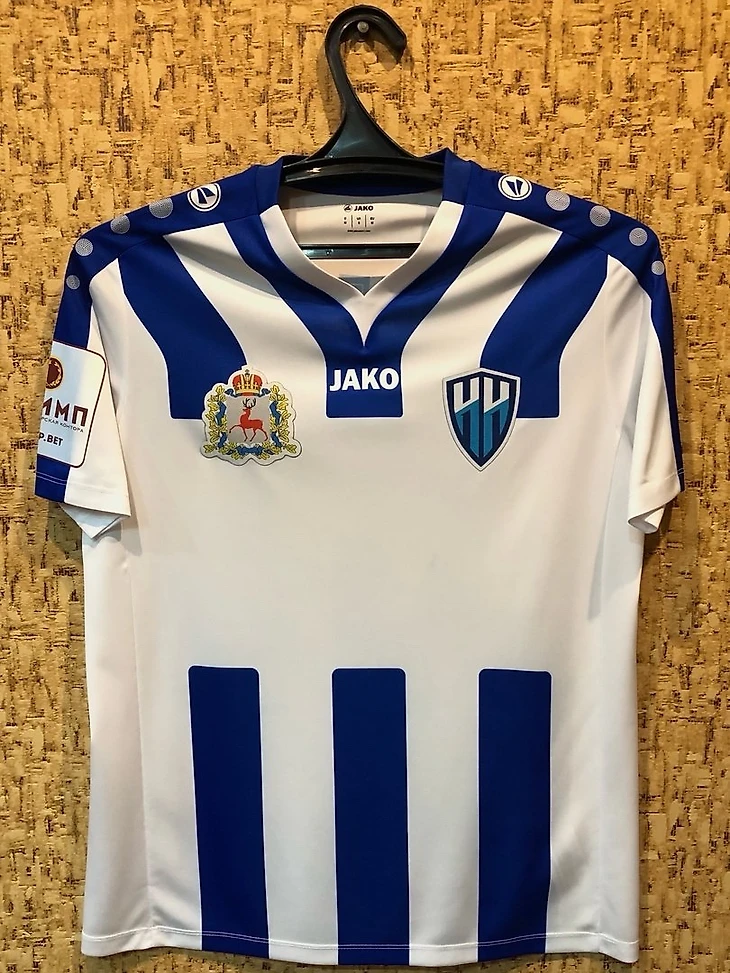Наиболее интересным домашним комплектом нижегородской команды мне видится форма от Jako сезона 2019/2020. Да, дизайн этот не уникальный, как минимум «Рига» имела такой же рисунок, только с голубым цветом, однако, не так много в нашей стране команд, использовавших бело-синие полосатые футболки.