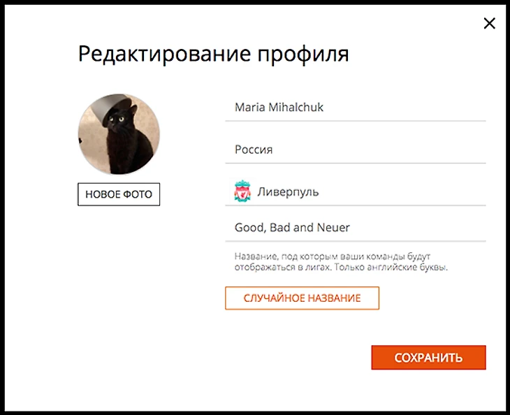 Меняйте аватарку и любимый клуб в два клика. Для вашей команды можно придумать оригинальное название, а отсутсвие гениальных идей компенсирует генератор случайных названий. Не пугайтесь, увидев в профиле No Country for Ronaldo или FC Drunk Smolov City.