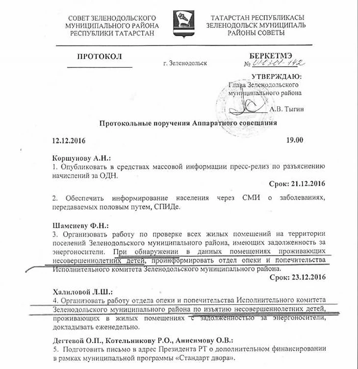 Но сейчас не об этом. На днях, в местной прессе всплыл официальный документ из одного района Татарстана, где глава издал поручение своим подчиненным изымать детей у должников за газ и электричество. Вот этот протокол с Аппаратного совещания: