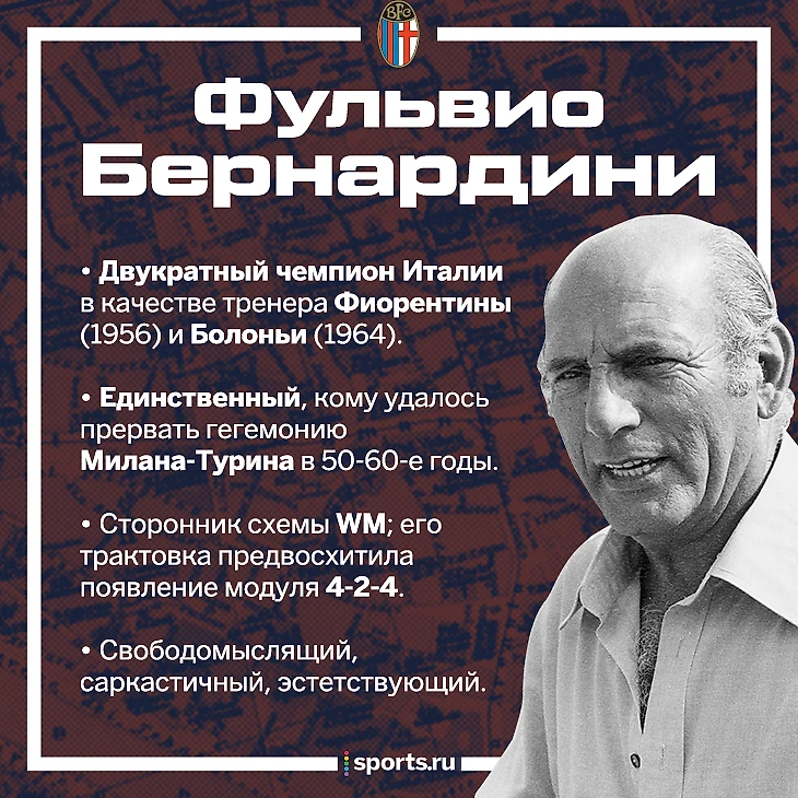 Та «Болонья» была свежа и красива. Она играла в вертикальный футбол с четырьмя форвардами, забросами в свободные зоны и сменой позиций. Впереди творил немецкий фантазиста Хельмут Халлер, слева играл рекордсмен Эцио Паскутти (его 10-матчевую голевую серию переписал только Батистута), на острие бомбил капоканноньере Харальд Нильсен. Натаскивал их Фульвио Бернардини – один из лучших тренеров своего времени.