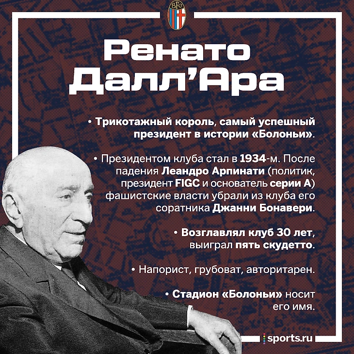 Далл’Ара был не в ладах с президентами иных клубов ещё со времён своего пришествия в Болонью, ведь там он сместил (не помню фамилию) - идеолога фашизма, через которого удобно было выходить на Дуче и решать проблемы.