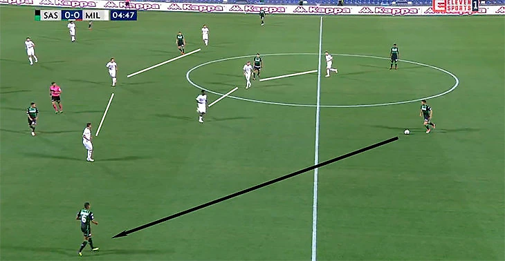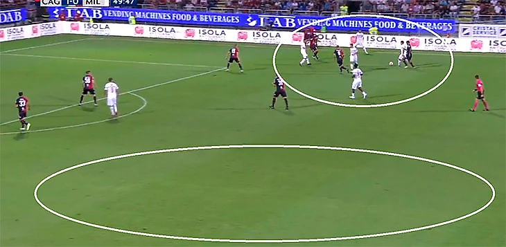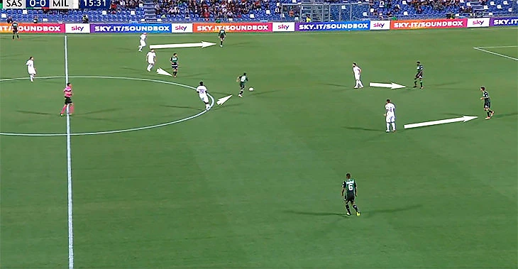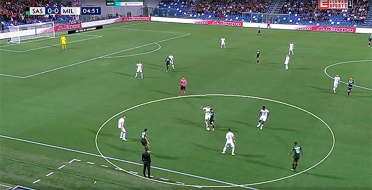 «Милан» перекрывает центр поля, оставляя свободного соперника на левом фланге. Через несколько секунд три игрока «Сассуоло» попадают в кольцо из четырех «россонери» без вариантов продвижения вперед или в центр.
