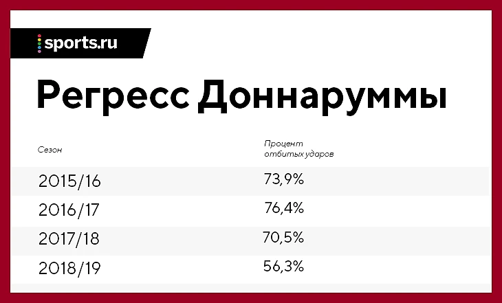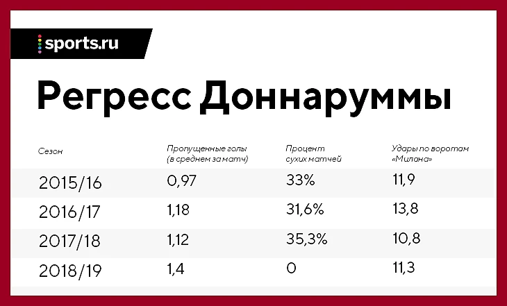 Цифры показывают любопытную динамику: в первые два сезона Доннарумма прибавлял, а с третьего года остановился и даже немного сдал (осенью тоже был ужасен, но к концу прошлого сезона улучшил статистику). Осенью-2018 Джиджо стремительно регрессирует.