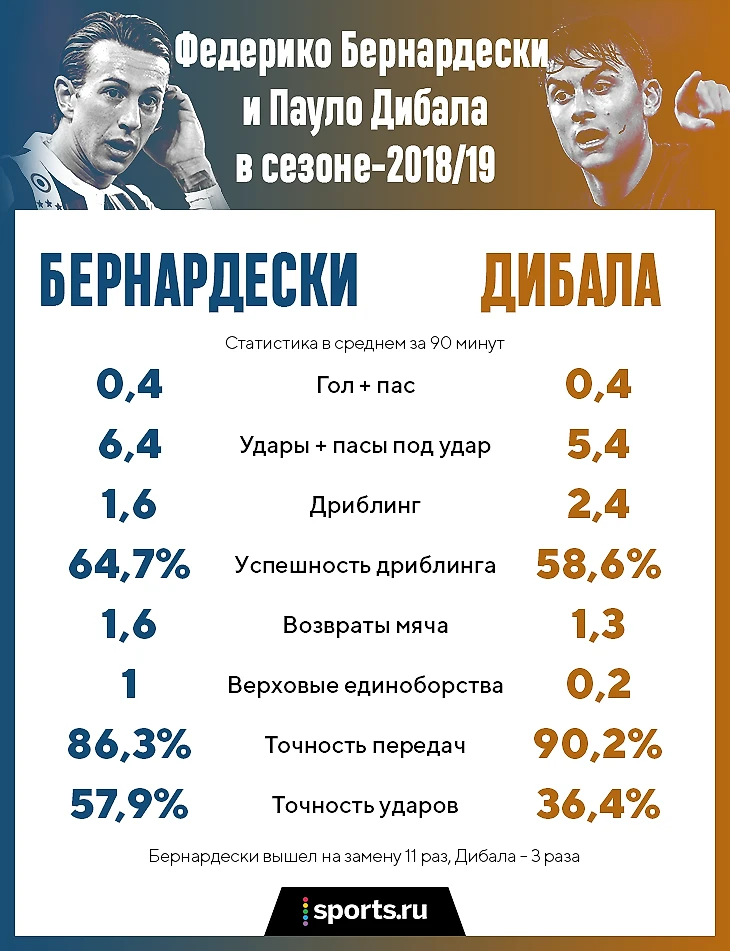 Понятно, что Бернардески чаще играл против уставших соперников. Но в целом расклад сохраняется и в тех матчах, которые Феде начинал в старте: итальянец как минимум на том же уровне исполняет вещи, в которых Дибала силен, и гораздо лучше делает все остальное. Он не так полезен в построении позиционных атак и точности передач, но опаснее бьет, острее пасует (в два раза превосходит аргентинца в ожидаемых ассистах) и больше работает в обороне.