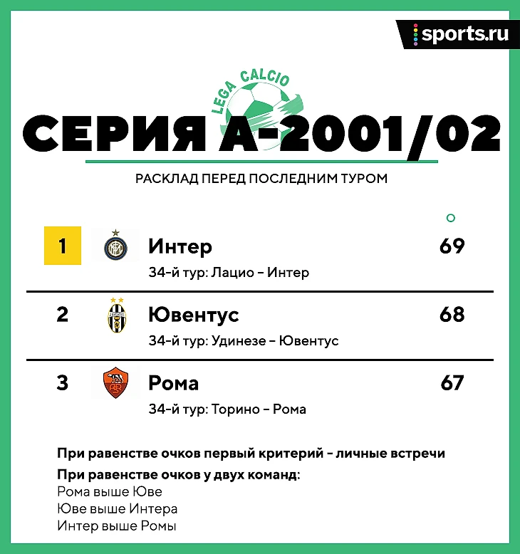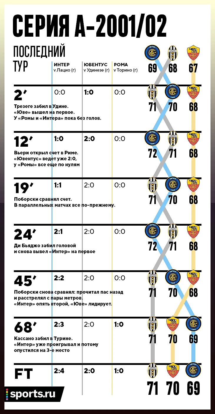 «Интер» мощно стартовал, весь сезон шел в лидерах, но в 30-м туре (чемпионат заканчивался в 34-м) неожиданно проиграл дома «Аталанте» и подпустил конкурентов. Итальянские газеты вышли с заголовками об очередном самоубийстве «нерадзурри» и на этот раз поспешили – в следующем туре вернулся Роналдо и забил 4 гола в 4 матчах. К последней игре «Интер» пришел первым.
