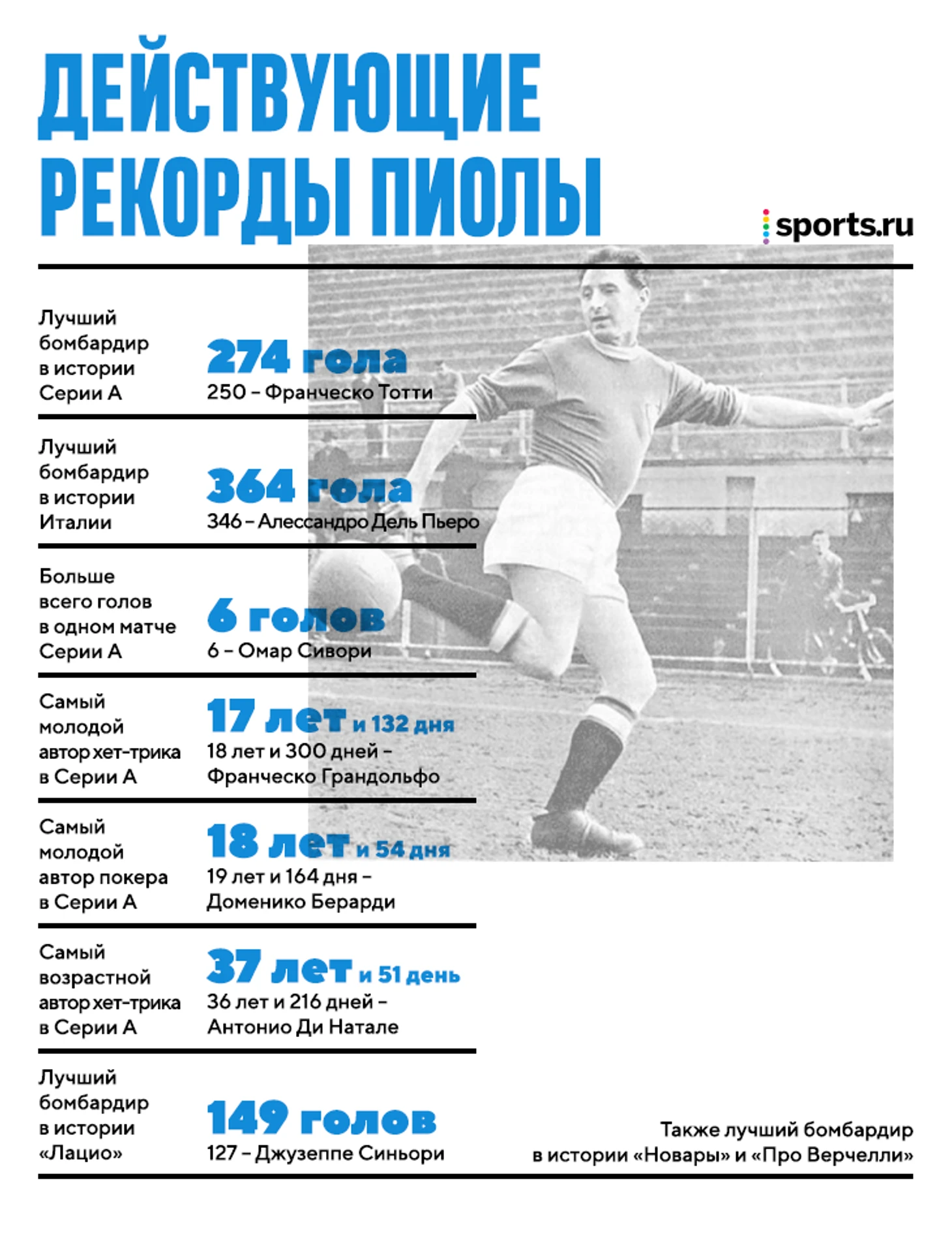 Пиола остался суперменом. Его рекорд в серии А (274 гола), возможно, продлил карьеру Тотти: Ческо еще в 2013-м пообещал уйти после того, как обойдет Пиолу, но дошел только до 250 голов. Дель Пьеро гонялся за статусом главного бомбардира в истории Италии – и все равно отстал от Пиолы на 18 мячей (всего за карьеру Сильвио забил 391 гол, но для официального рекорда отнимают военный чемпионат и считают 364).