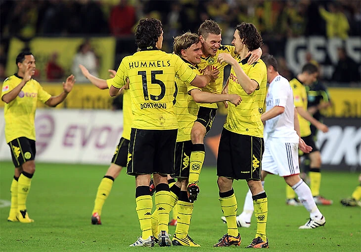 А против них – «Бавария», которая весной сделала золотой дубль, которую только в финале Лиги чемпионов остановил «Интер»; «Бавария» Роббена и Рибери, хотя мы этого и не знаем пока что, а еще – пикового Марио Гомеса, забивающего почти в каждом матче, Мюллера, Швайнштайгера, Лама. Эта «Бавария» выиграет восемь чемпионств в 2010-х – и выиграла бы все десять, если бы не «Боруссия».