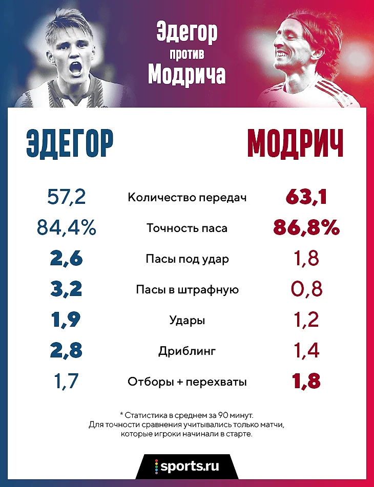 Эдегор уступает Модричу всего в двух компонентах – точности паса и возврате мячей. Разница в первом незначительна и обусловлена более атакующим стилем норвежца. Разница в оборонительных действиях отчасти связана с «Реал Сосьедадом». Баски предпочитают строгую позиционную структуру, а Эдегор активен всегда на чужой половине и очень не любит опускаться к своей штрафной. На стадии без мяча он намного эффективнее именно в системах с высоким прессингом.