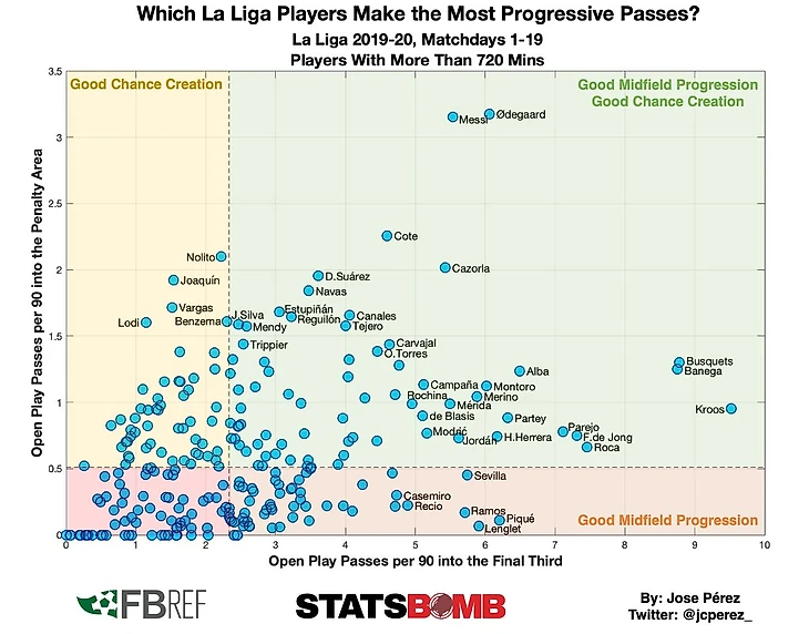 В Ла Лиге только Месси играет в пас так же тонко, качественно и разнообразно. Они намного превосходят всех по передачам в штрафную (вертикальная ось на картинке ниже). При этом Эдегор держится на околотоповом уровне по передачам в последнюю треть. И он на одиннадцать лет младше – в отличие от Лео, у него еще есть время дорасти до уровня Лаудрупа.